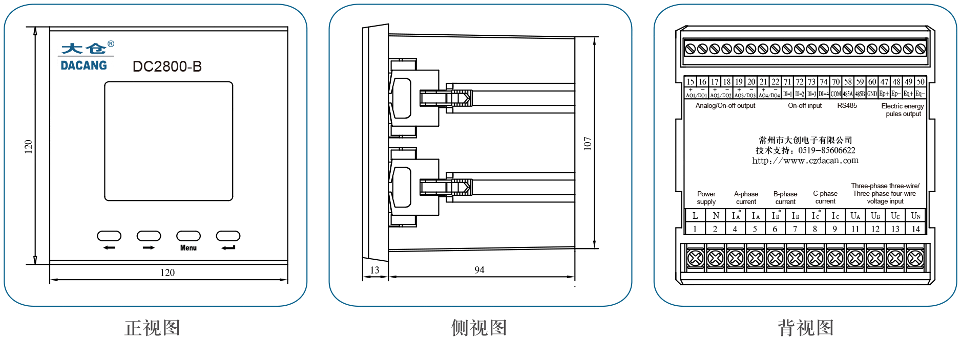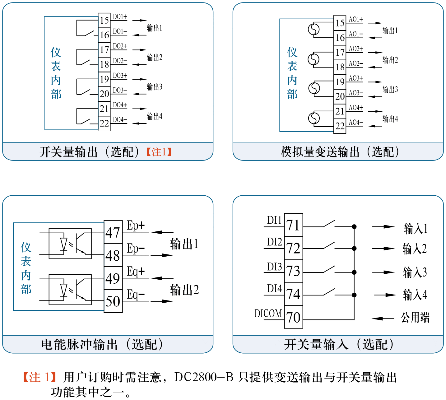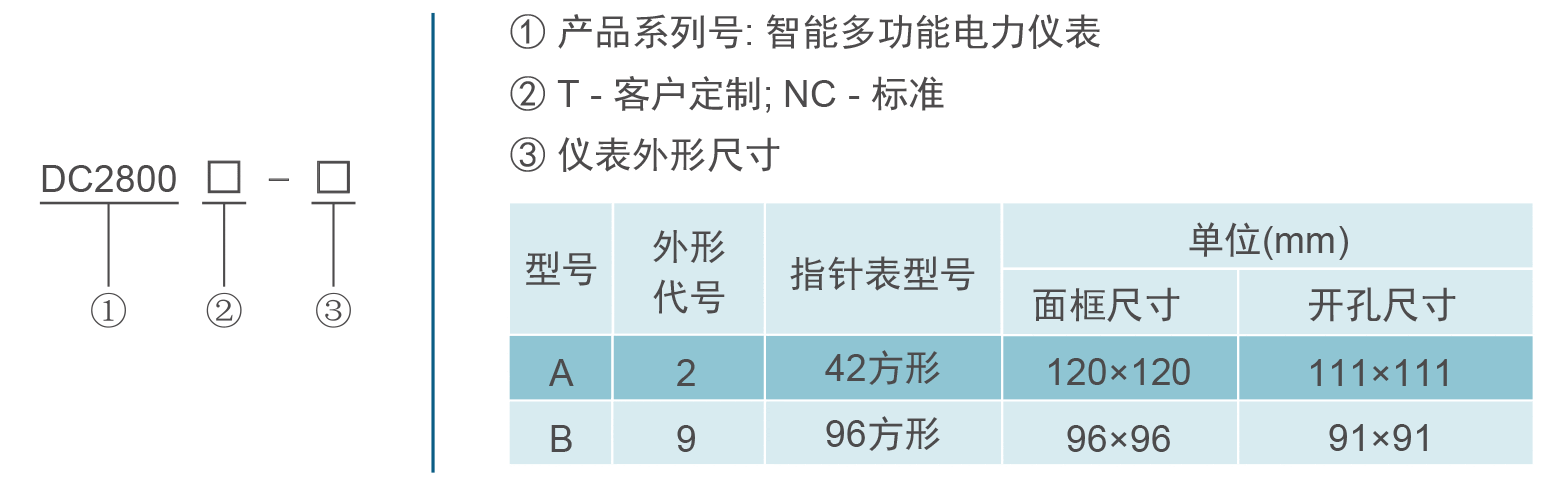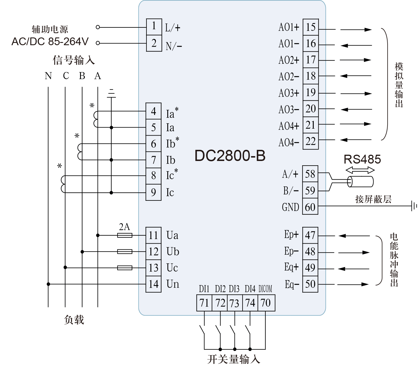 注:以上图片仅供参考,实际参数以出厂配套的产品说明书为准。 接线说明: ◇ 电压输入:输入电压不要高于产品的额定输入电压(100V或400V),否则应考虑使用PT,为了便于维护,建议使用接线排。 ◇ 电流输入:标准额定输入电流为5A,大于5A的情况应使用外部CT。如果使用的CT上连有其它仪表,接线应采用串接方式,去除产品的电流输入连线之前,一定要先断开CT一次回路或者短接二次回路,为便于维护建议使用接线排。 ◇ 要确保输入电压、电流相对应,相序一致,方向一致;否则会出现数值和符号错误!(功率和电能)。 ◇ 仪表可以工作在三相四线方式或者三相三线方式,用户应根据现场使用情况选择相应的接线方式。一般在没有中心线的情况下使用三相三线方式,在有中心线的情况下使用三相四线方式,三相三线可以只安装2个CT(A和C相),三相四线需要安装三个CT(在只有2CT情况下可以合成另一相电流)。 注意:仪表内可设置两种接线方式,实际接线方式和表内设置方式必须一致,否则仪表的测量数据不准确。 9. 订购示例 l 型号: DC2800-B l 信号输入: AC220V, AC200A/5A l 接线类型: 三相三线 (2CT, 2PT) l 变送输出: 4路 输出1: DC4-20mA 对应 Uab 输出 2: DC4-20mA 对应 Ia 输出3: DC4-20mA 对应 P总 输出4: DC4-20mA 对应Q总 l 通讯: RS485 l 其他: 其他出厂预设置(未作说明则按照默认设值出厂) |