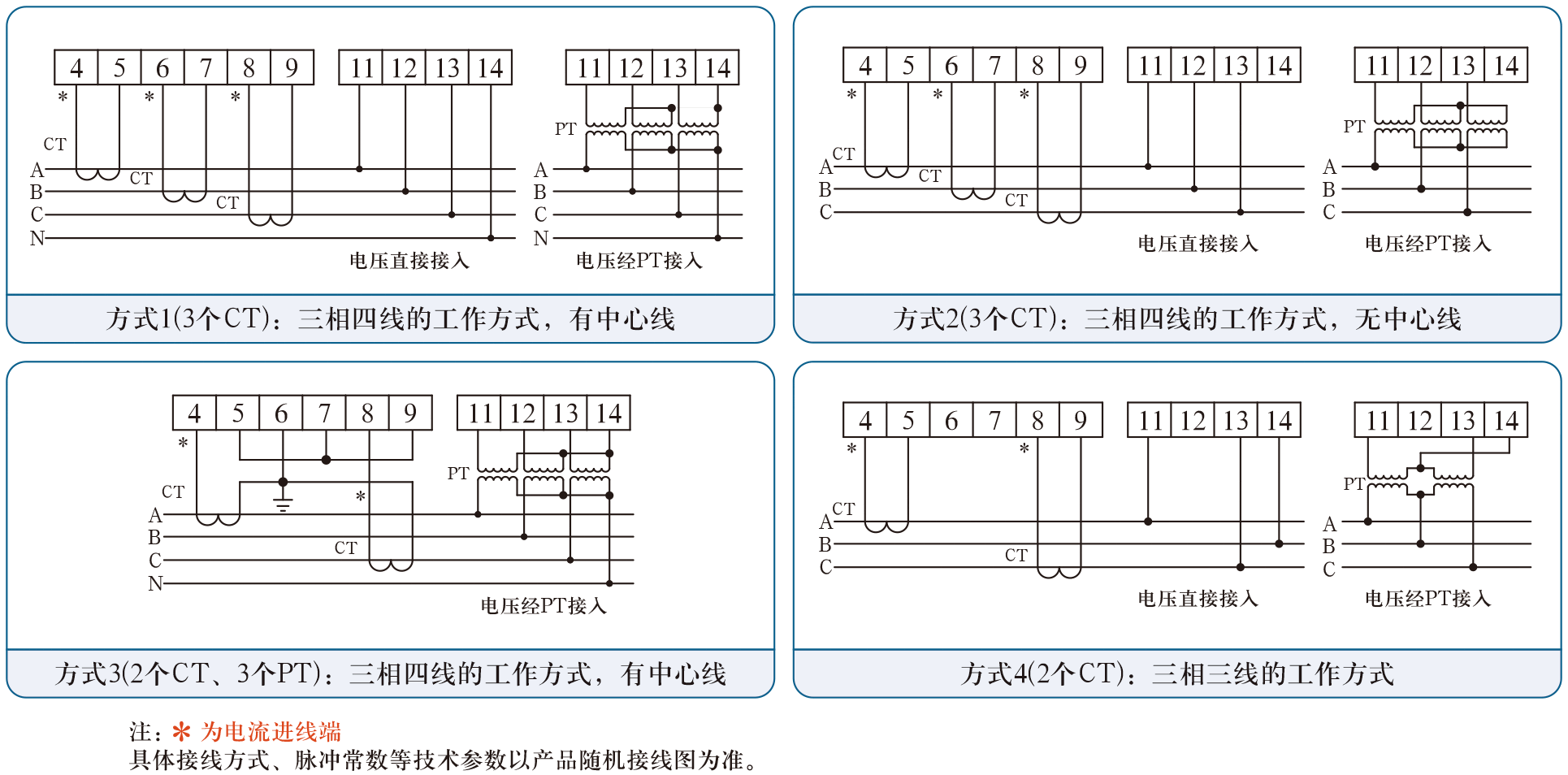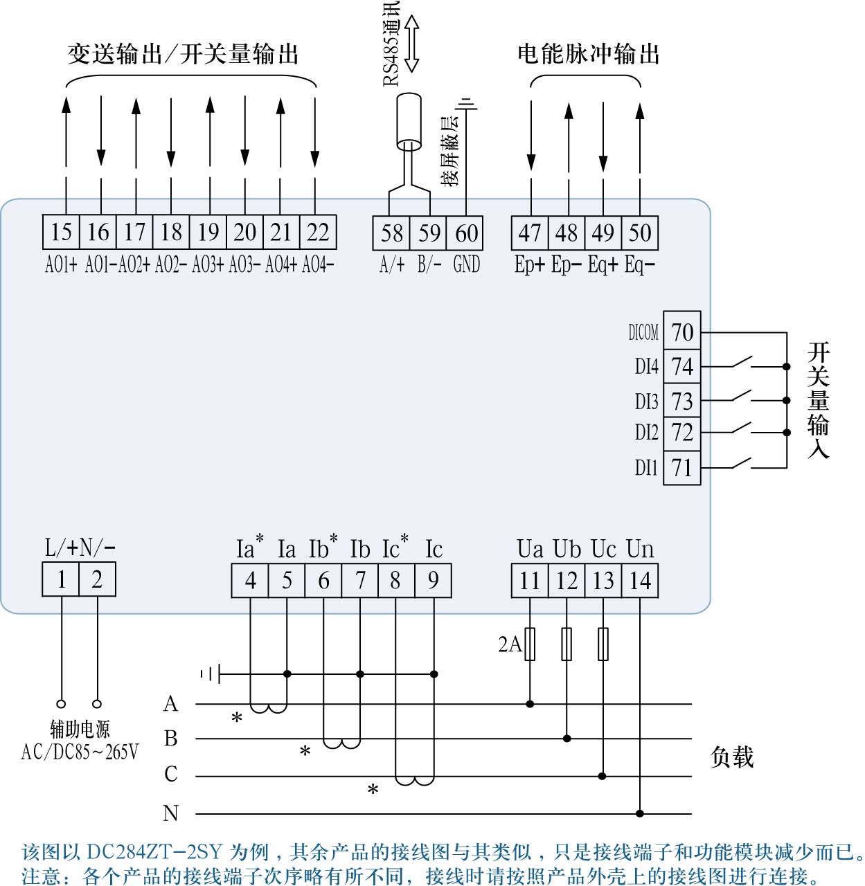 注:以上图片仅供参考,实际参数以出厂配套的产品说明书为准。 接线说明: ◇ 电压输入:输入电压不要高于产品的额定输入电压(100V或400V),否则应考虑使用PT,为了便于维护,建议使用接线排。 ◇ 电流输入:标准额定输入电流为5A,大于5A的情况应使用外部CT。如果使用的CT上连有其它仪表,接线应采用串接方式,去除产品的电流输入连线之前,一定要先断开CT一次回路或者短接二次回路,为便于维护建议使用接线排。 ◇ 要确保输入电压、电流相对应,相序一致,方向一致;否则会出现数值和符号错误!(功率和电能)。 ◇ 仪表可以工作在三相四线方式或者三相三线方式,用户应根据现场使用情况选择相应的接线方式。一般在没有中心线的情况下使用三相三线方式,在有中心线的情况下使用三相四线方式,三相三线可以只安装2个CT(A和C相),三相四线需要安装三个CT(在只有2CT情况下可以合成另一相电流)。 注意:仪表内可设置两种接线方式,实际接线方式和表内设置方式必须一致,否则仪表的测量数据不准确。 9. 订购示例 l 型号: DC284Z-2HY l 信号输入: AC10kV/0.1kv, AC200A/5A l 接线类型:三相三线 (2CT, 2PT) l 传输输出: 4-ways 传输 1: DC4-20mA 对应 Uab 传输 2: DC4-20mA对应 Ia 传输 3: DC4-20mA 对应 Psum 传输 4: DC4-20mA对应 Qsum l 通讯: RS485 l 其他: 其他出厂预设置(未作说明则按照默认设值出厂) |