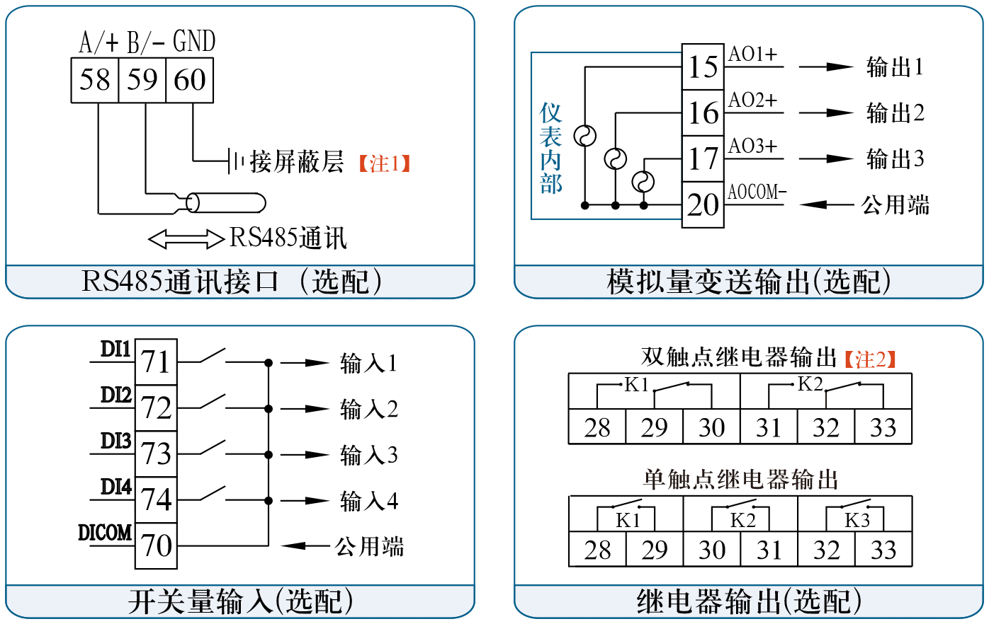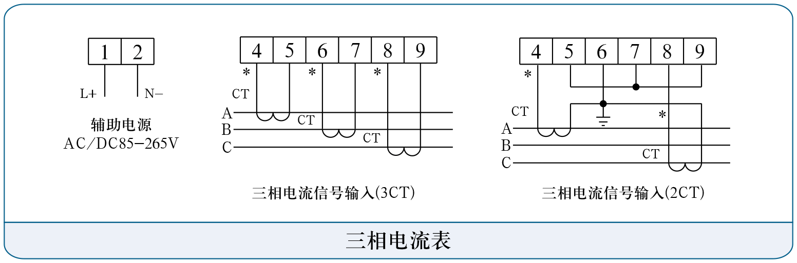 注:以上图片仅供参考,实际参数以出厂配套的产品说明书为准。 接线说明: ◇ 电压输入:输入电压不要高于产品的额定输入电压(100V或400V),否则应考虑使用PT,为了便于维护,建议使用接线排。 ◇ 电流输入:标准额定输入电流为5A,大于5A的情况应使用外部CT。如果使用的CT上连有其它仪表,接线应采用串接方式,去除产品的电流输入连线之前,一定要先断开CT一次回路或者短接二次回路,为便于维护建议使用接线排。 ◇ 要确保输入电压、电流相对应,相序一致,方向一致;否则会出现数值和符号错误!(功率和电能)。 ◇ 仪表可以工作在三相四线方式或者三相三线方式,用户应根据现场使用情况选择相应的接线方式。一般在没有中心线的情况下使用三相三线方式,在有中心线的情况下使用三相四线方式,三相三线可以只安装2个CT(A和C相),三相四线需要安装三个CT(在只有2CT情况下可以合成另一相电流)。 注意:仪表内可设置两种接线方式,实际接线方式和表内设置方式必须一致,否则仪表的测量数据不准确。 9. 订购示例 l 型号: 三相数显电流表 DC284I-AK4 l 电源: AC 220V l 变比: AC 100A/5A l 其他: 其他出厂预设置(未作说明则按照默认设值出厂) |