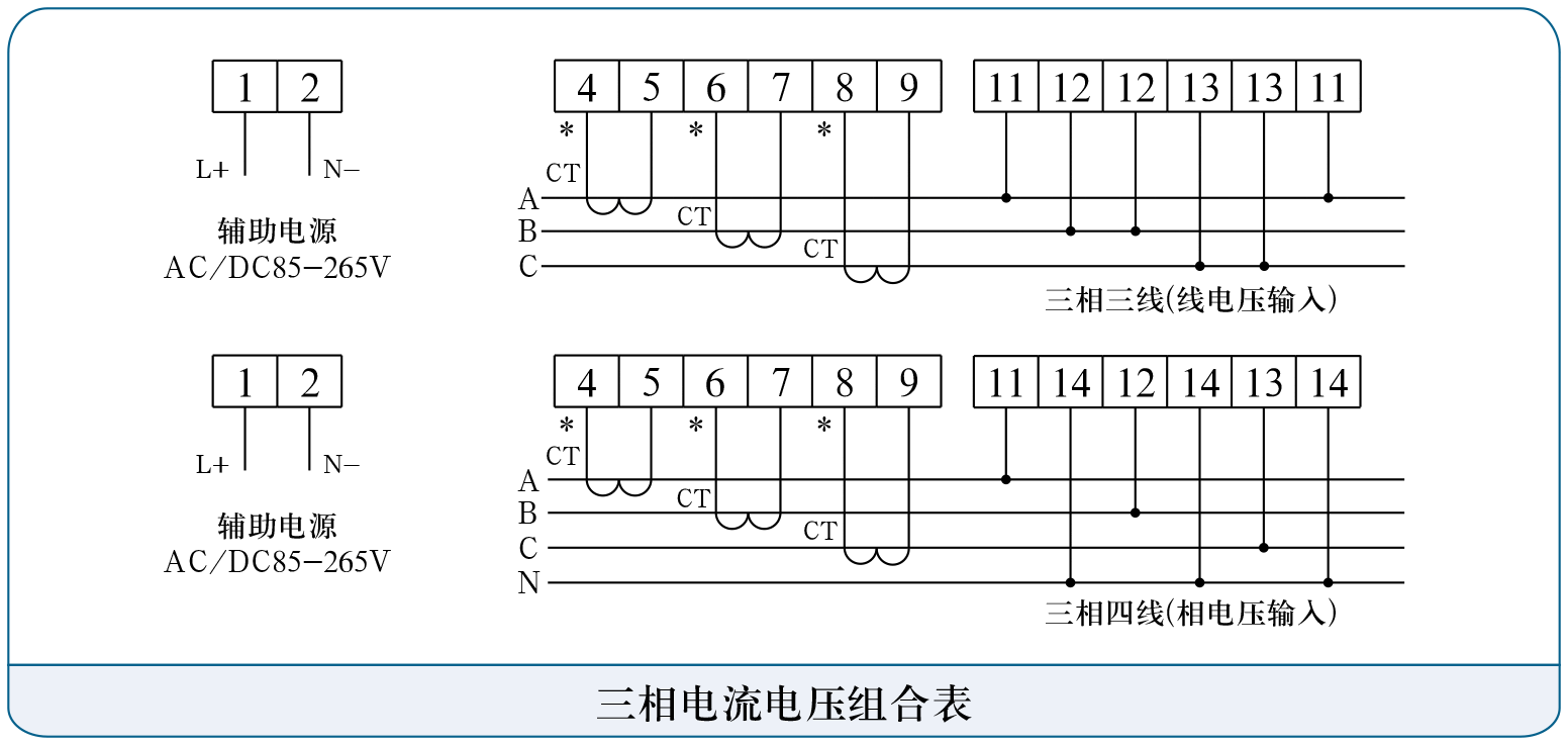 注:以上图片仅供参考,实际参数以出厂配套的产品说明书为准。 接线说明: ◇ 电压输入:输入电压不要高于产品的额定输入电压(100V或400V),否则应考虑使用PT,为了便于维护,建议使用接线排。 ◇ 电流输入:标准额定输入电流为5A,大于5A的情况应使用外部CT。如果使用的CT上连有其它仪表,接线应采用串接方式,去除产品的电流输入连线之前,一定要先断开CT一次回路或者短接二次回路,为便于维护建议使用接线排。 ◇ 要确保输入电压、电流相对应,相序一致,方向一致;否则会出现数值和符号错误!(功率和电能)。 ◇ 仪表可以工作在三相四线方式或者三相三线方式,用户应根据现场使用情况选择相应的接线方式。一般在没有中心线的情况下使用三相三线方式,在有中心线的情况下使用三相四线方式,三相三线可以只安装2个CT(A和C相),三相四线需要安装三个CT(在只有2CT情况下可以合成另一相电流)。 注意:仪表内可设置两种接线方式,实际接线方式和表内设置方式必须一致,否则仪表的测量数据不准确。 8. 订购示例 l 型号: DC284IU-2K4 l 电源: AC 220V l 变比: AC100A/5A, AC380V l 其他: 其他出厂预设置(未作说明则按照默认设值出厂) |